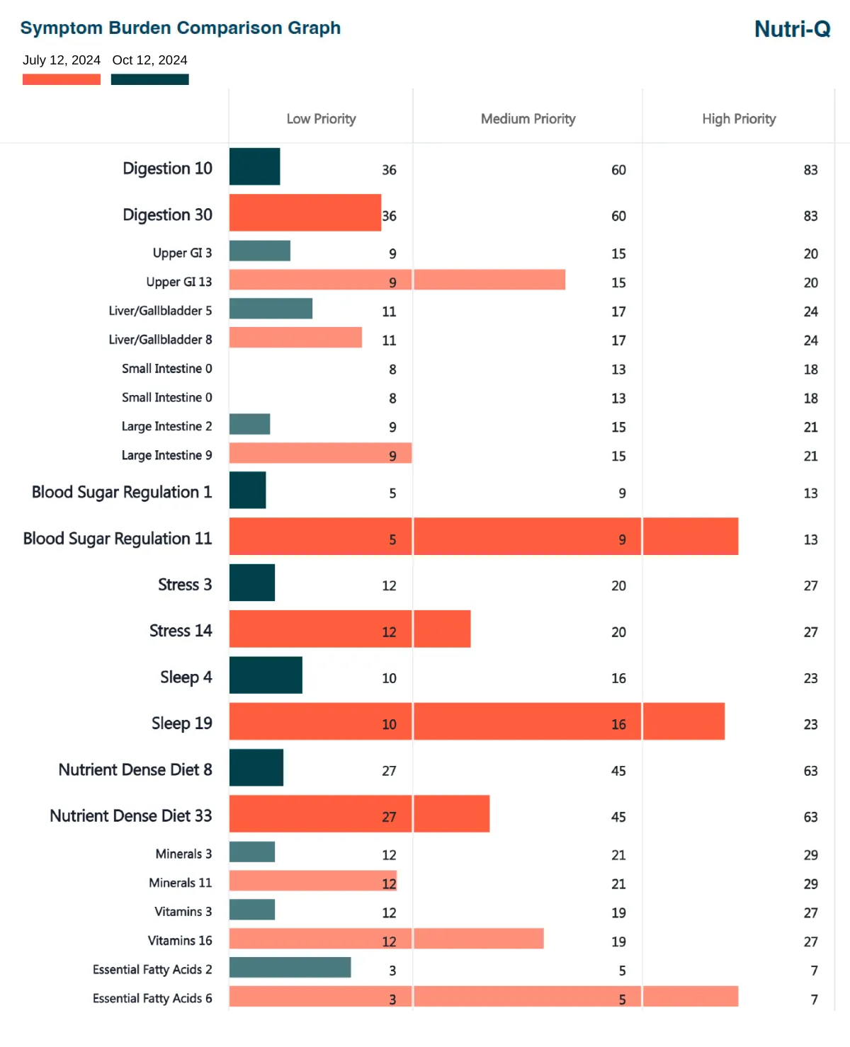 The NAQ is made up of hundreds of detailed questions that cover various aspects of your current health. After completing the questionnaire, Nutri-Q generates a Symptom Burden Graph, which visually represents areas where your body may need the most support. The graph provides a clear picture of your foundational health areas—like digestion, blood sugar regulation, stress management, sleep, and nutrition—and how these may be affecting your overall well-being.